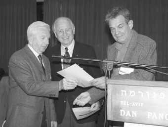 דוד אביר (מימין) מקבל תעודת חבר כבוד מדב סער.