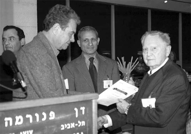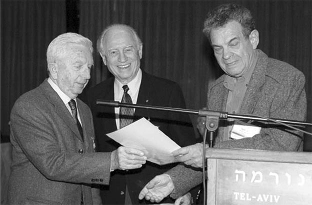 יו"ר ועד האגודה, דב סער (מימין) מעניק תעודות חברות כבוד באגודה לפרופ' יוסף זינגר (במרכז) ולחיים קנת (משמאל)
