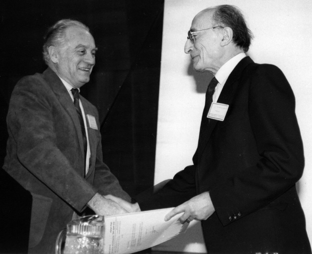 יו"ר ועד האגודה, פרופ' יוסף זינגר (משמאל) מעניק את תעודת חבר הכבוד ליוסף צינצנהיים (מימין)