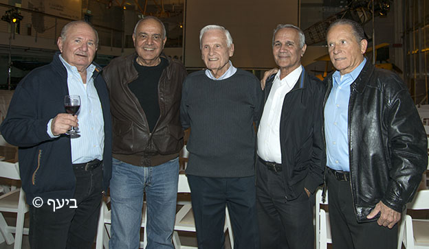 ותיקי חיל האוויר. מימין לשמאל: תא"ל רן רונן (פקר),אלוף הרצל בודינגר, אל"מ דני שפירא, רב-אלוף דני חלוץ, תא"ל יאלו שביט.
